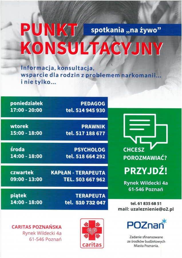 To dzieło prowadzone przez Caritas ma już wieloletnią tradycję. Pierwszy dyżur kapłana i pedagoga – przy Rynku Wileckim 4a w Poznaniu – miał miejsce 8 kwietnia 2002 r. W miarę upływu lat Punkt poszerzał swoją ofertę. Aktualnie można korzystać z porad: kapłana, terapeuty, pedagoga, psychologa, a nawet prawnika. Nasi specjaliści: zdiagnozują problem, dostarczą informacji uzależnionym i ich rodzinom o możliwości podjęcia profesjonalnej terapii, zmotywują i skierują do leczenia, udzielą wsparcia i pomocy psychospołecznej osobom po zakończeniu terapii odwykowej i ich rodzinom, otoczą opieką duszpasterską.